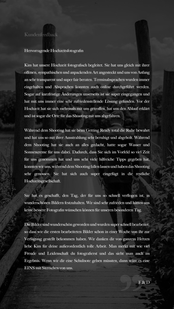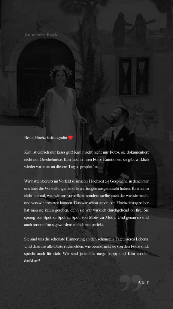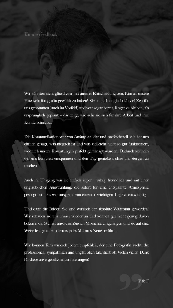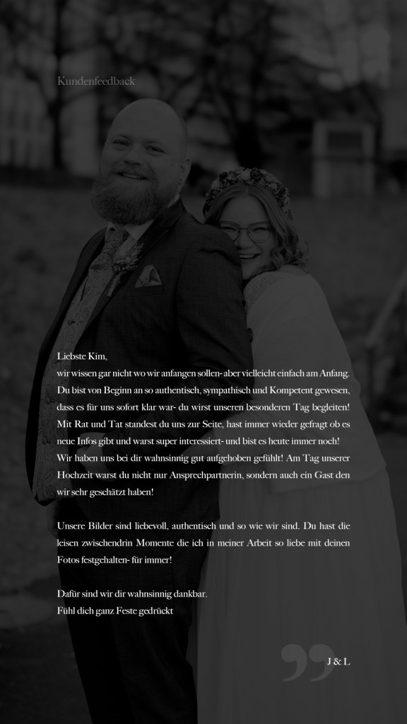 Eure Hochzeit ist mehr als nur ein Tag – sie ist ein zeitloser Moment, den ihr immer und immer wieder erleben könnt. Ich freue mich, eure Erinnerungen für euch festzuhalten.